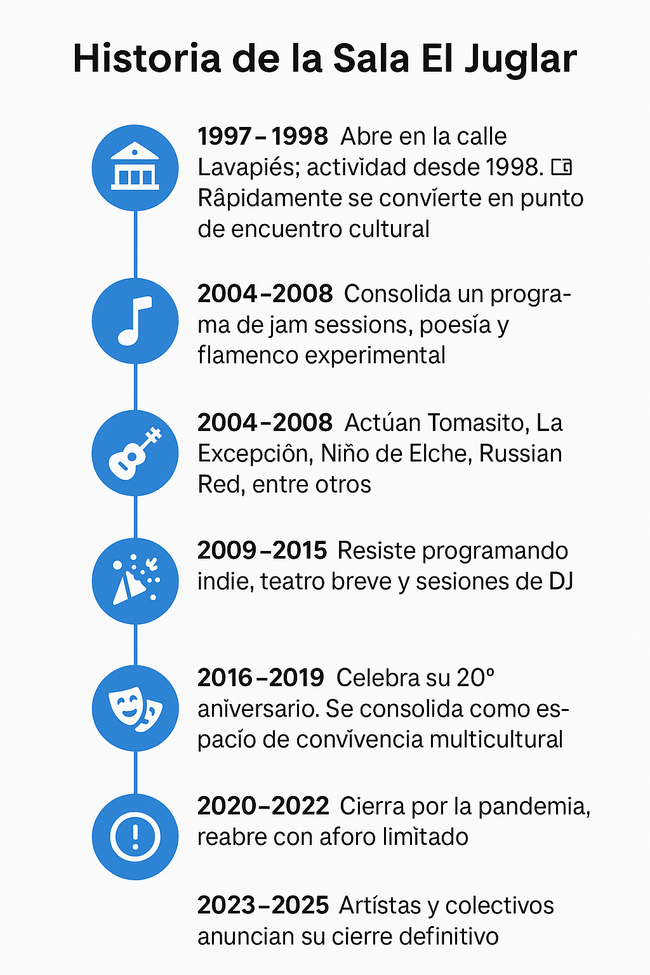 Fundada en 1997, El Juglar nació como un híbrido entre bar, sala de conciertos y espacio escénico. Sus fundadores apostaron por un modelo abierto: un lugar donde convivían flamenco, hip hop, jazz, poesía, teatro, ciclos de cortos de cine y música electrónica en un ambiente que desafiaba etiquetas.