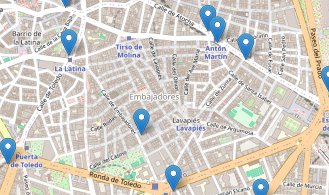 Mapa de los quioscos de prensa que quedan cerca de Lavapiés, del que habrá que eliminar el de Aurelio