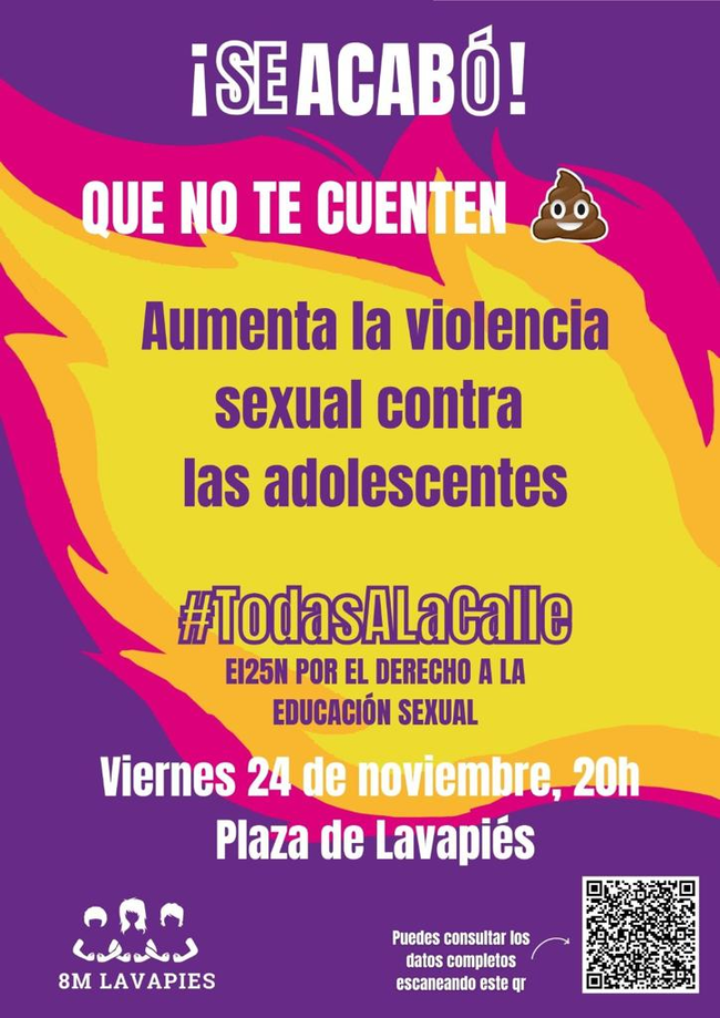 Antes de ese día, cuya mayor manifestación feminista será la convocada por la Comisión 8M y que partirá de Atocha el sábado a las 18 horas de la tarde, el movimiento feminista local vive este viernes su jornada de protesta con una concentración en la plaza de Lavapiés a las 20 horas, la lectura de un manifiesto y una performance, a cargo de la asociación La Tortuga, en la que se visibilizarán cada una de las violencias contra la mujer que exponen en los carteles que han distribuido.