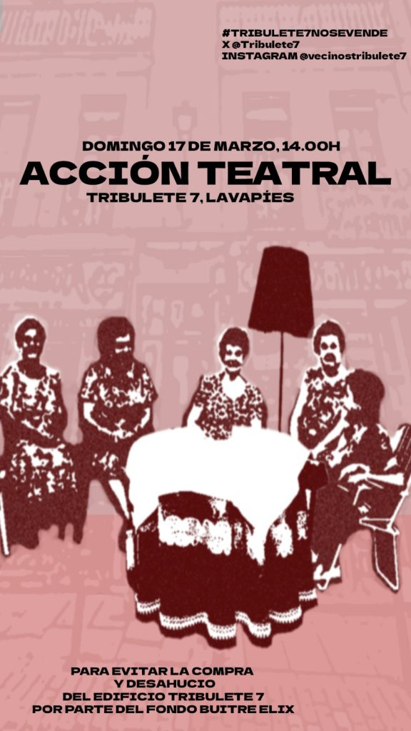 «Decidimos sacar nuestros muebles a la vía pública (sillas, butacas, mesas, percheros, etc..) para simbolizar que nos quieren echar a la calle. Tribulete se convertirá en un lugar de protesta y encuentro, un gran salón en el que compartiremos el espacio creando red y tejido social. Además, participarán numerosos artistas que se inflitrarán entre l@s vecin@s, dando lugar a diferentes performances, generando surrealismo en forma de protesta. Todas las personas que se encuentren en Tribulete serán protagonistas y atrezzo a la vez de un gran espectáculo nunca antes visto«, aclaran sobre el funcionamiento de la protesta del domingo desde Tribulete 7.