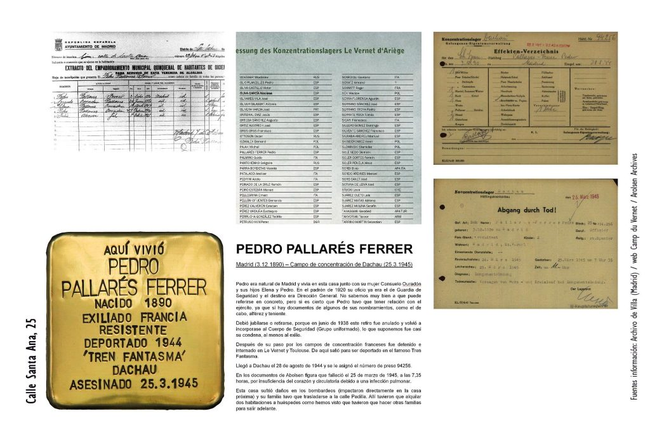 Pedro era natural de Madrid y vivía en Santa Anta 25 junto a su mujer, Consuelo Ouradón, y sus hijos Elena y Pedro. En el padrón de 1920 su oficio ya era el de Guardia de Seguridad y el destino era Dirección General. No se sabe a qué puede referirse en concreto, pero sí es cierto que Pedro tuvo que tener relación con el ejército, ya que hay documentos de algunos de sus nombramientos, como los de cabo, alférez y teniente. Debió jubilarse o retirarse porque en junio de 1938 este retiro fue anulado y volvió a incorporarse al Cuerpo de Seguridad (Grupo uniformado), lo que suponemos fue casi su condena, al menos al exilio. Después de su paso por los campos de concentración franceses, fue detenido e internado en Le Vernet y Toulouse. De allí salió para ser deportado en el famoso Tren Fantasma. Llegó a Dachau el 28 de agosto de 1944 y se le asignó el número de preso 94256. En los documentos de Abolsen figura que falleció el 25 de marzo de 1945, a las 7:35 horas, por insuficiencia del corazón y circulatoria debido a una infección pulmonar. Santa Ana 25 sufrió daños en los bombardeos de la Guerra Civil y la familia de Pedro tuvo que trasladarse a la calle Padilla. Allí tuvieron que alquilar dos habitaciones a huéspedes, como hemos visto que tuvieron que hacer otras familias, para salir adelante.