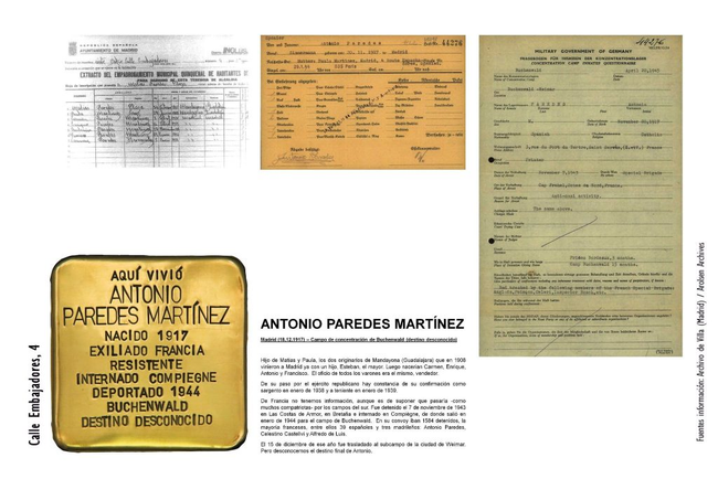 Hijo de Matías y de Paula, los dos originarios de Mandayona (Guadalajara) que en 1908 vinieron a Madrid ya con un hijo, Esteban, el mayor. Luego nacerían Carmen, Enrique, Antonio (18-12-1917) y Francisco. El oficio de todos los varones era el mismo: vendedor. De su paso por el ejército republicano hay constancia de su confirmación como sargento en enero de 1938 y como teniente en enero de 1939. De Francia no se tiene información, aunque es de suponer que pasaría -como muchos compatriotas- por los campos del sur. Fue detenido el 7 de noviembre de 1943 en Las Costas de Armor, en Bretaña, e internado en Compiègne, de donde salió en enero de 1944 para el campo de Buchenwald. En su convoy iban 1584 detenidos -la mayoría franceses- y entre ellos, 39 españoles y tres madrileños: Antonio Paredes, Celestino Castellvi y Alfredo de Luis. El 15 de diciembre de ese año fue trasladado al subcampo de la ciudad de Weimar, pero se desconoce el destino final de Antonio.