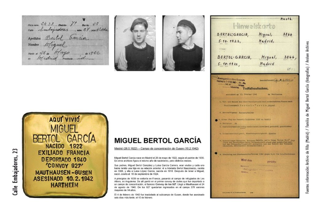 Miguel Bertol GArcía nace en Madrid el 26 de mayo de 1922, según el padrón de 1930. En otros archivos figura el mismo año de nacimiento, pero distintos meses. Sus padres, Miguel Bertol González y Luisa García Carrera, eran viudos y cada uno había tenido una hija en su relación anterior. Él, a Adelaida Bertol Nascimento, nacida en 1908; ella, a Luisa López García, nacida en 1918. Después de tener a Miguel nació Josefa, el 18 de septiembre de 1924. A principios de 1939 se exiliaría en Francia, pasando al campo de refugiados de Les Alliers, en Angulema. De allí partió en el primer convoy de civiles que fue deportado a un campo de concentración, el famoso Convoy de los 927. Llegó a Mauthausen el 24 de agosto de 1940. De los 927 quedarían ingresados en el campo 378 varones mayores de 14 años. El 4 de febrero de 1942 fue trasladado al subcampo de Gusen. Fue asesinado el 10 de febrero de 1942 en el Castillo de Hartheim.