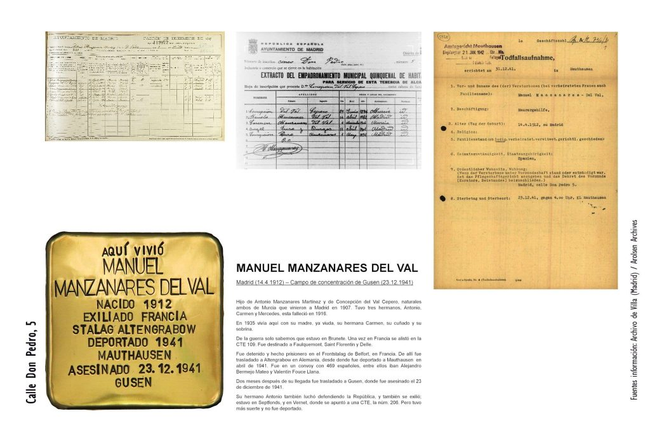 Manuel Manzanares del Val (Madrid, 14-4-1912) fue hijo de Antonio Manzanares Martínez y de Concepción del Val Cepero, naturales ambos de Murcia que vinieron a Madrid en 1907. Tuvo tres hermanos: Antonio, Carmen y Mercedes, fallecida en 1916. En 1935 vivía en Don Pedro 5 con su madre, ya viuda, su hermana Carmen, su cuñado y su sobrina. De la guerra sólo sabemos que estuvo en Brunete. Una vez en Francia se alistó en la CTE 109. Fue destinado a Faulquemont, Saint Florentin y Delle. Detenido y hecho prisionero en el Frontstalag de Berfort, en Francia, fue trasladado a Artengravow (Alemania) desde donde fue deportado a Mauthausen en abril de 1941. Fue en un convoy con 469 españoles, entre los que estaban Alejandro Bermejo Mateo y Valentín Fouce Llana. Dos meses después de su llegada fue trasladado a Gunsen, donde sería asesinado el 23 de diciembre de 1941. Su hermano Antonio también luchó defendiendo la República y también se exilió: estuvo en Septfonds y en Vernet, donde se apuntó a una CTE, la número 206, peru tuvo más suerte que Manuel y no fue deportado.
