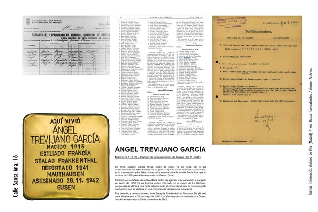 En 1935, Milagros García Rivas, madre de Ángel (Madrid, 9-1-1916), ya era viuda, por lo que se desconocen los datos básicos de su padre. Ángel tuvo una hermana, Carmen, que, junto a su esposo y dos hijos vivían todos en la cas de la calle Santa Ana, que en octubre de 1936 pasó a llamarse calle de Máximo Gorki. Participó en la defensa de la República dentro del ejército y fue ascendido a sargento en enero de 1938. Ya en Francia estuvo internado en el campo de Le Barcarés, desde donde firma una carta pidiendo asilo al cónsul de México. Al no conseguirlo suponemos que se alistaría en una compañía de trabajadores extranjeros. Fue detenido y hecho prisionero en el Stalag de Frankenthal, en Alemania. De allí salió para MAuthausen el 24 de mayo de 1941. Un año después fue trasladado a Gusen, donde fue asesinado el 26 de noviembre de 1942.