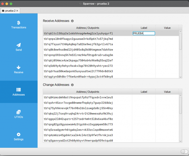 Para etiquetar, haz doble click en el espacio y escribe la info que necesitas guardar. Para mantener esas etiquetas debes exportar la wallet al formato de archivo de Sparrow y guardarlo bien.