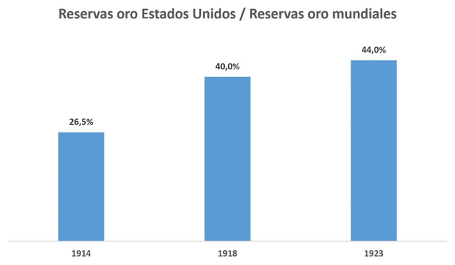 Estados Unidos, por su parte, pasó de ser un país deudor neto con el resto del mundo antes de la Primera Guerra Mundial, a ser un acreedor neto después de la guerra. Estados Unidos durante este periodo acumula unas enormes reservas de oro, en 1914 contaban con el 26,5% de las reservas mundiales de oro depositadas en bancos centrales, en 1918 la cifra subió hasta el 40%, en 1923 llegó a ser el 44% (Glasner, 1989).