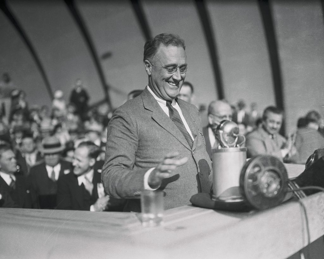 27 Sep 1932, Hollywood, Los Angeles, California, USA --- Franklin D. Roosevelt, Governor of New York, speaking at Los Angeles during his campaign for the presidency in 1932. --- Image by © Bettmann/CORBIS