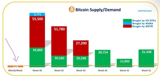 Este que estamos observando nos dice qué ha pasado en las últimas semanas, porque seguramente muchos escuchamos que MicroStrategy iba a recoger deuda privada y con eso comprar Bitcoin. Que desde el lado de inversor, wow, esta tarea que hace Sailor es significativa, ya no nos empieza a gustar desde otros lados con sus pronunciamientos. Pero bueno, desde este lado de inversor conseguir deuda privada a cero tasa, es un acierto grande. ¿Y qué fue lo que pasó? Que esa deuda que él buscaba o que propuso encontrar, pues fue superada con creces. Él esperaba algo así como unos 1,700 millones de dólares en una de sus compras y resultó consiguiendo 2,600 millones de dólares. Entonces, ¿eso qué le permitió? Lo que está en rojo. es que en esas tres semanas donde Bitcoin pasó de 70.000 a prácticamente los 100.000, pues en la primera semana nos compró 27.200 Bitcoin y en la segunda 51.780 y en la tercera 55.500. Entre las tres semanas nos compró más de 130 mil Bitcoin. Pero no era el único comprador. Aquí en verde observan a los CTF, a las compras que realizan estos instrumentos financieros con el dinero de los inversores que lo dejan allí mediante acciones. y las compras en las tres semanas superaron las 20,000 unidades. Pero hay más. Hubo empresas también como Mara, la minera, que nos compró más de 5,700 bitcoins y le pasó lo mismo. Fue a recaudar deuda privada a tasa cero y consiguió más de lo que esperaba. Entonces, esto lo que hizo fue que durante principalmente esta última semana el precio de Bitcoin llegar a los 100 mil dólares, porque vimos ese apetito de cuando las cosas en general, en lo macroeconómico y principalmente en el estado de la industria se sincronizan de buena forma, el apetito de los inversores se vuelve voraz. Entonces, no solo fue lo de Trump, sino que vimos cómo las empresas inversores de los ETF dijeron, espere, nos podemos anticipar a las potenciales compras de Bitcoin que realice Estados Unidos. Entonces eso desde mi perspectiva fue un motor bastante significativo.
