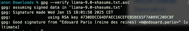 En Terminal, aplica el comando "gpg --verify" + el archivo "liana-9.0-shasums.txt.asc":