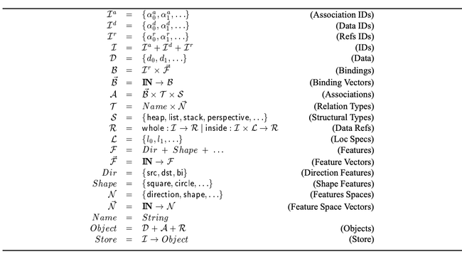 The set of identifiers I is formed by the union of three sets of identifiers, respectively for associations Ia, data Id, and data references Ir (abbreviated refs). Data, typically documents, are not formalized in the hypertext layer; however, as we need to refer to them, we assume the existence of a set D of Data. The set A of associations is defined by the cartesian product of three sets, respectively of binding vectors B, relation types T and structural types S. A binding is composed of a ref ID and a vector of features; the former is meant to be the identifier of a reference, which “attaches” on a document. A vector of features can be regarded as an ordered set of properties, where each property identifies a value in a set of features, such as direction of a binding, geometric property, etc.