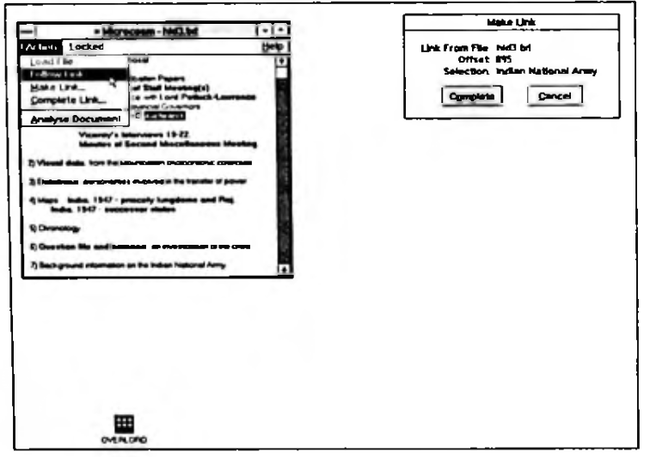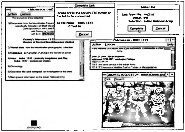 The first full implementation of Microcosm in MS Windows was ready for application development in January 1990. Our first application has been in the area of history and in particular in the development of an electronic version of the Mountbatten Archive. This archive is kept and maintained by the Hartley Library at the University of Southampton, and contains approximately 250,000 text documents, 50,000 photographs, 35 reels of cine film, and various audio and video tapes from the collection of the late Lord Mountbatten of Burma. The challenge is to make this archive available to historians in a way that permits explicit and implicit relationships between the different elements of the archive (text, photographs, film etc.) to be stored and analysed. Together with other colleagues at the University we have created a prototype of the electronic archive, taking documents and photographs from the period 1947-8, when Mountbatten was Viceroy of India. Currently, the text documents are stored as ASCII files on the hard-disc and the photographs are stored on a laser videodisc. Images from the latter are displayed in windows on the VGA screen of the computer workstation via a VideoLogic DVA-4000 board. This application provided the content of Figures i, and has allowed us to explore the potential of the various features that are built into Microcosm. A fuller report of this application and our work with the Department of History at Southampton is given in [Colson & Hall 1990].