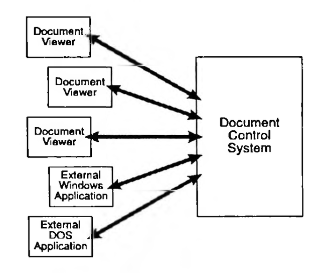 In a Microcosm session, at least two tasks are running. The Document Control System opens documents routes messages and supports links. Most of the time it is not visible to the user except as an icon at the bottom of the screen. One or more Document Viewers are used to display document on the screen. One viewer is running for each document visible. Different viewers are used for different types of document or medium. Currently there are viewers for text (plain ASCII), monochrome and colour bit-mapped graphics, vector graphics, animated graphics, CD sound, and still or moving video from a video disk. There may be a mix of viewers on the screen at the same time and the software imposes no limit in practice to the number running. Document viewers communicate by means of messages, and all messages are routed through the Document Control System. A third type of task, External Applications may also be running. These are applications which are not part of the Microcosm system but can be linked in by the Document Control System. For example, a spreadsheet can be used for graphing figures, or information can be extracted from a database, or from another hypertext system.