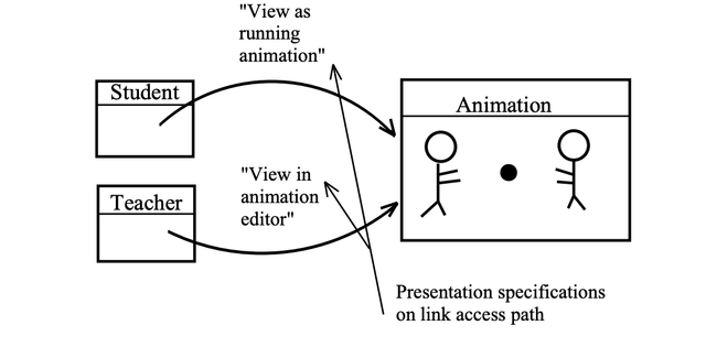 Figure 2 illustrates the importance of the presentation specifications mechanism. In this figure, there is an animation component taken from a computer-based training hypertext. This animation component can be accessed from two other components, a ‘‘teacher’’ component and a ‘‘student’’ component. When following the link from the student component, the animation should be brought up as a running animation. In contast, when coming from the teacher component, the animation should be brought up in editing mode ready to be altered. In order to separate these two cases, the runtime layer needs to access presentation information encoded into the links in the network. Presentation specifications are a generic way of doing just this. Like anchoring, it is an interface that allows the storage layer to communicate in generic way with the runtime layer without violating the separation between the two layers.