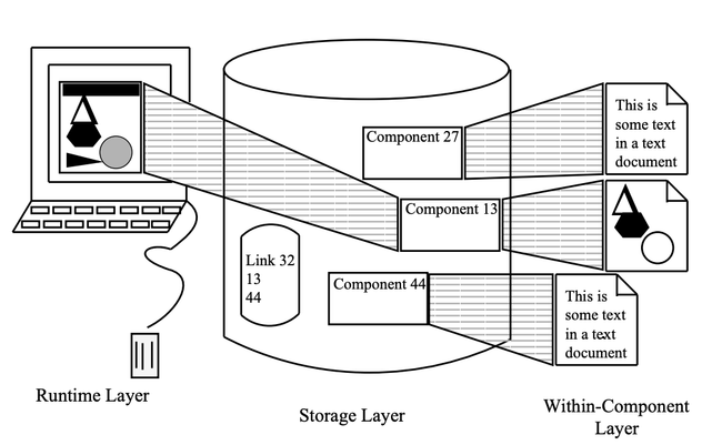 Figure 3: A depiction of the three layers of the Dexter model as embedded in an actual hypertext system