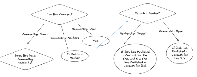 A community of Java programmers allows anybody to read, associate, and comment. The list of associates is public. Alice can "join" to become publicly associated, and she has the ability to comment. But she cannot write until a site admin gives her a write capability.
