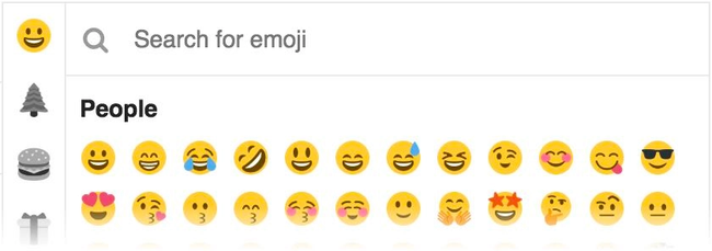 Access a searchable list of standard emoji. Choose from four different emoji sets, or define your own custom emoji.