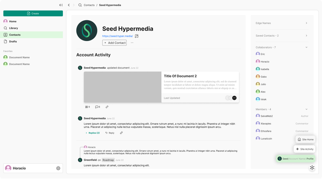 The profile view will be contained in the contacts page. Here users can navigate though the profile which will contain account activity, collaborator list, members list (authors and commentors) and any other relevant information.