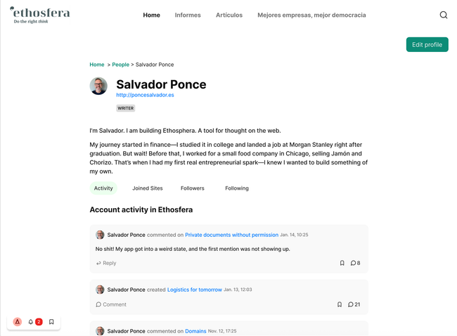 2.2. User sees member's detail with different areas: Bio, Activity,