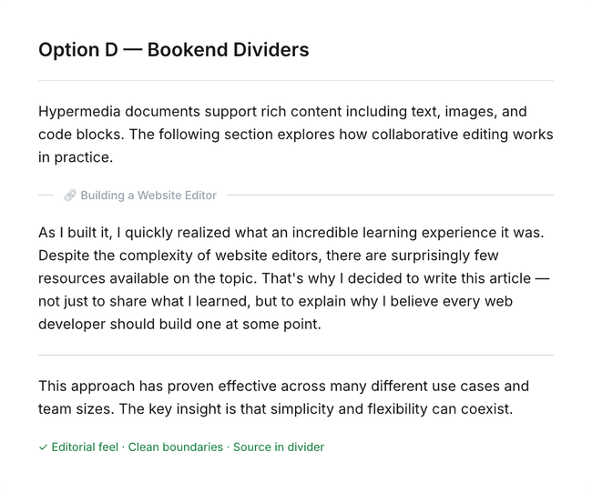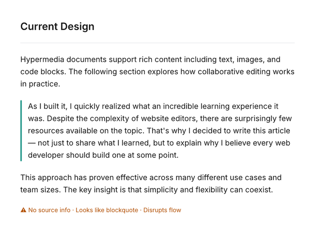 Content itself has no special styling, preserving reading flow (solves problem 3)