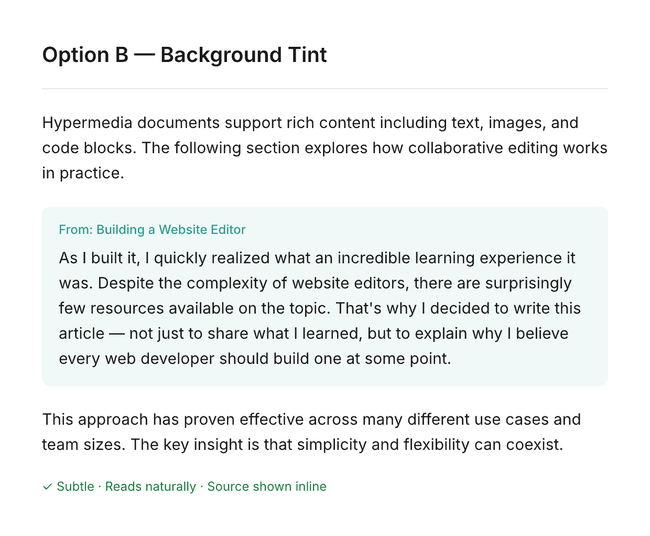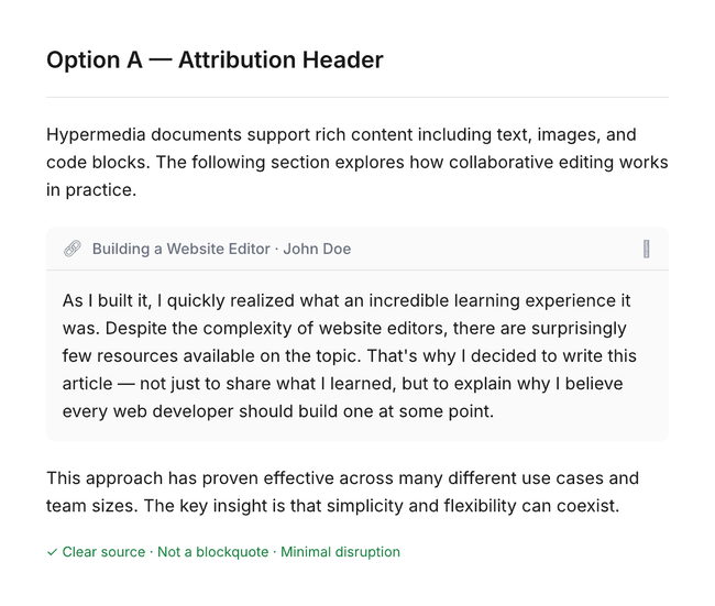 A possible hybrid approach (A + B) could combine the header for attribution with a very subtle background tint for longer embeds, making boundaries clearer when the content spans many paragraphs.