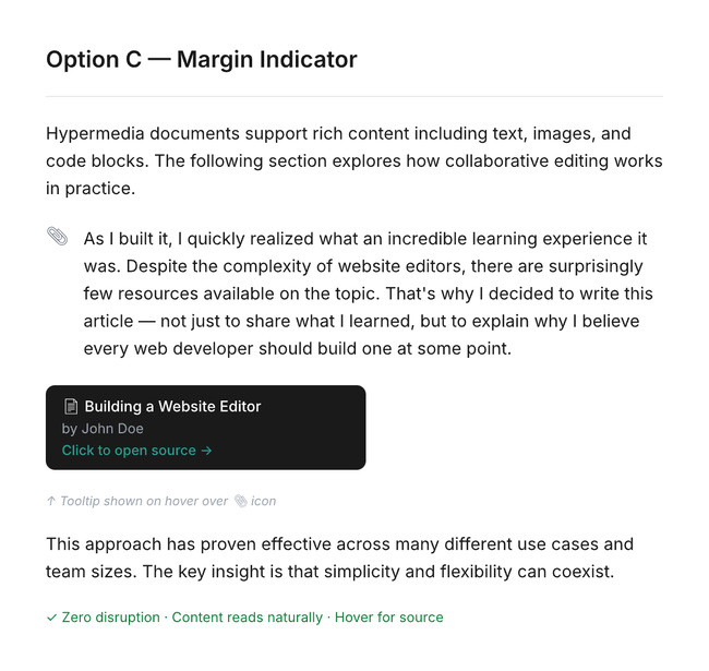 Place a small icon in the left margin with source info revealed on hover. Zero visual disruption to the content.