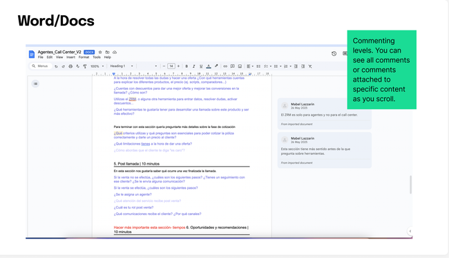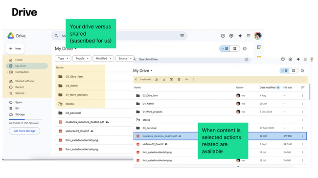 The way content is nested: folders > files > share/comment. My files or shared with me.