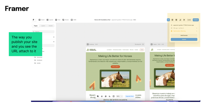 Pages organization on the left that can have subpages. Publish together with the link.