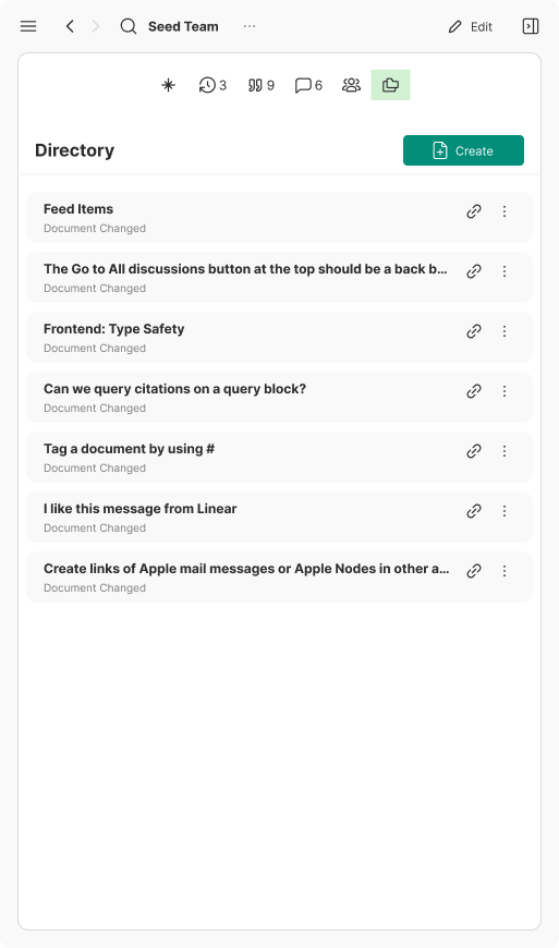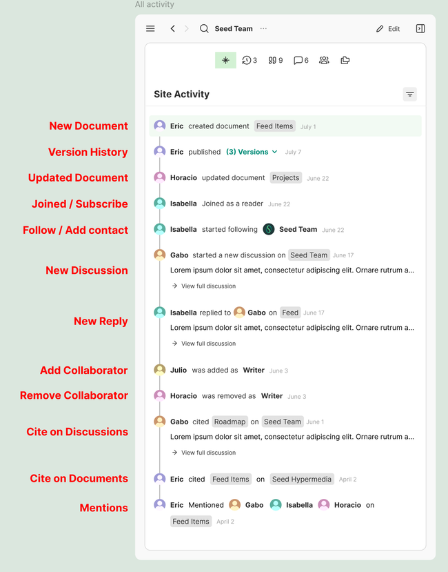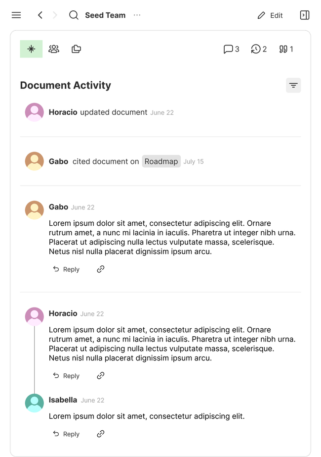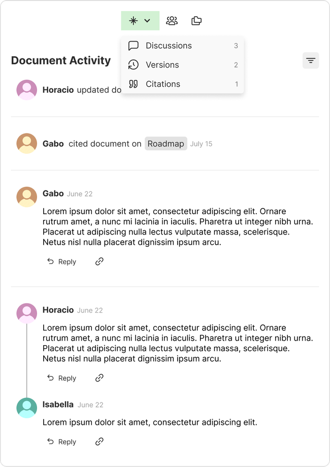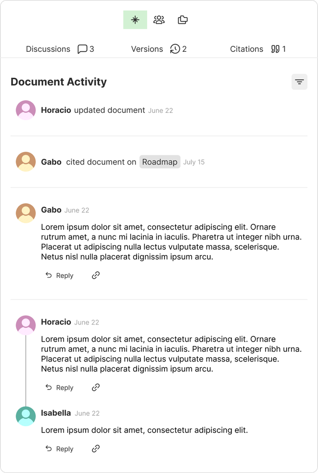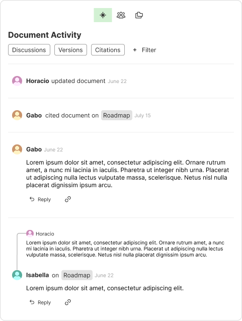 Document updates will represent the version history, citation on document will represent citations and comments and threaded blocks will represent discussions.
