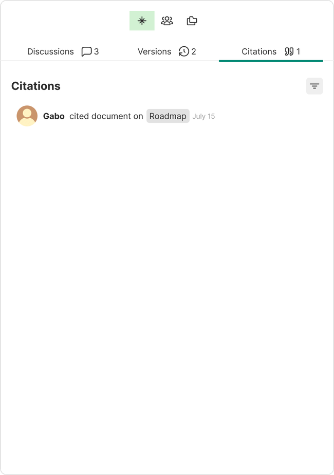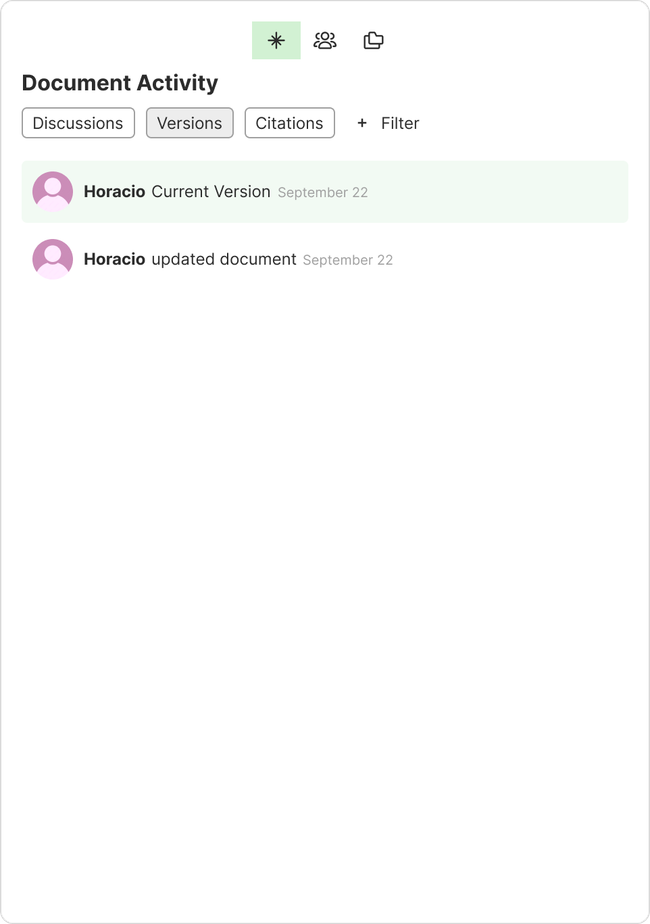 The activity panel will have 3 initial tabs the document activity feed, the collaborators panel and the directory. Version History, Citations and Discussions will be subtabs of the Activity Feed Tab. Commenting is a very important tool that we want users to use, this is why it can not be placed inside a filter as filters add complexity to the experience that many user will not use or understand. Due to this, basic experiences should be as easy to use and understand as possible.