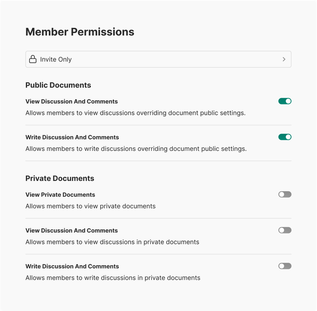 Membership permissions will be able to change depending if the document is public or private. (These permissions will be site wide)